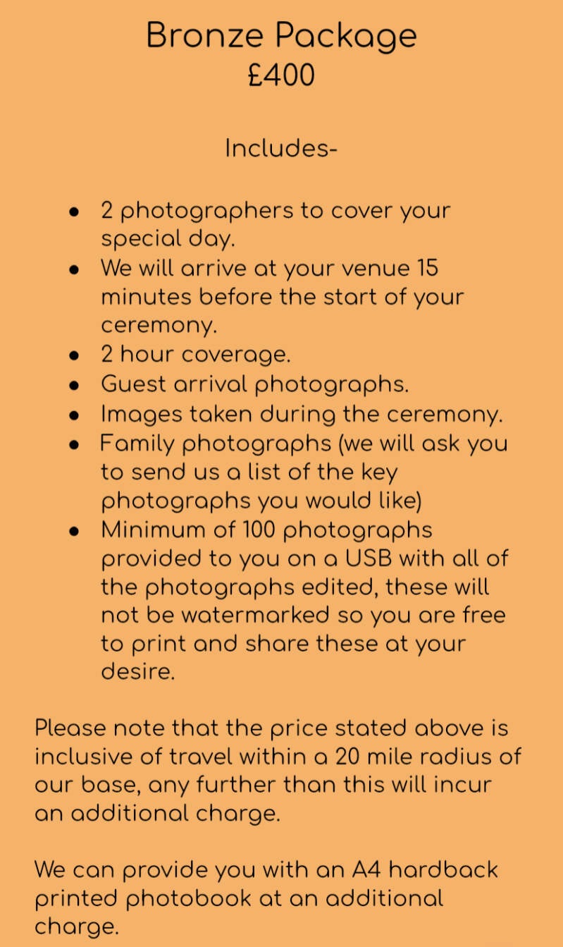 Please see below our packages and pricing list, if you require something that you don't see listed below, please send us a message containing all details and we will see what we can do for you.